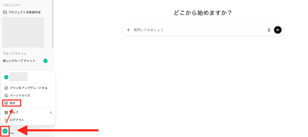ChatGPTの「設定」箇所