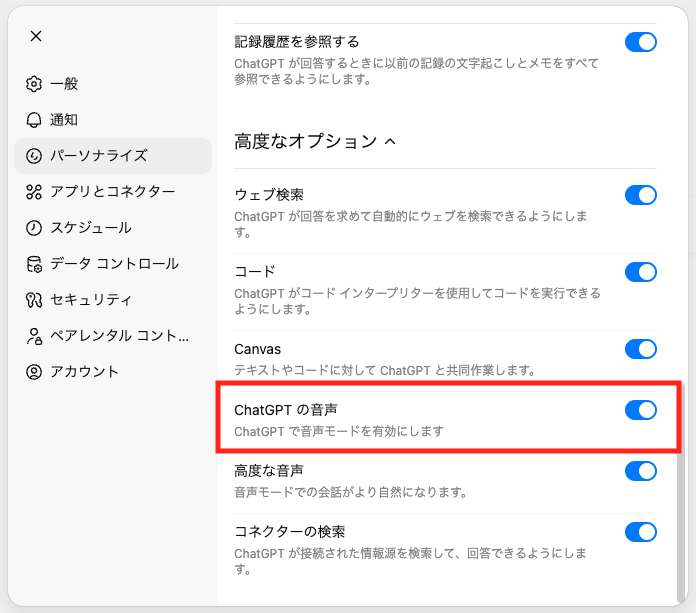 ChatGPTの音声機能は、設定画面で無効化されていると音声アイコンが表示されず、利用できません。設定画面を開き、「パーソナライズ」内にある「ChatGPTの音声」のスイッチがオンになっているか確認してください。オフになっている場合は有効にすることで、音声入力や音声会話が利用できるようになります。